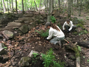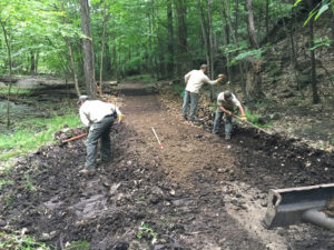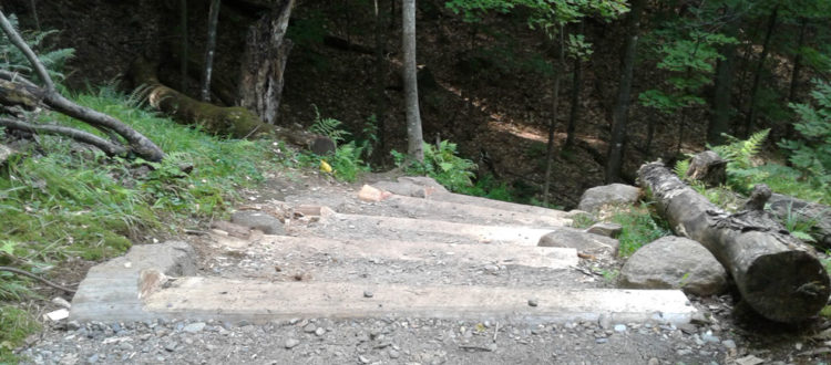 À l’aide de pelles, de pioches et de plusieurs journées de travail, des escaliers de pierre en quinconce ont été aménagés et plusieurs paliers ont été ajoutés sur le sentier jaune en montant vers le sommet. Certaines interventions ont été réalisées à l’aide de la pelle mécanique afin de remettre en état des tronçons des sentiers jaune, vert et rouge. Des sections de sentiers ont été resurfacées, des roches ont été extraites, des fossés ont été nettoyés et des sorties d’eau ont été ajoutées.